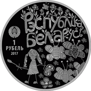 On the left-hand side - a relief image of the State Emblem of the Republic of Belarus; in the center – a stylized inscription in two lines: "РЭСПУБЛIКА БЕЛАРУСЬ" (THE REPUBLIC OF BELARUS), below - a composition of childrens’ drawings; on the left - the denomination: "ДВАЦЦАЦЬ РУБЛЁЎ" (TWENTY ROUBLES) on the silver coin and "АДЗIН РУБЕЛЬ" (ONE ROUBLE) on the copper-nickel one, the year of coinage and alloy standard (on the silver coin).