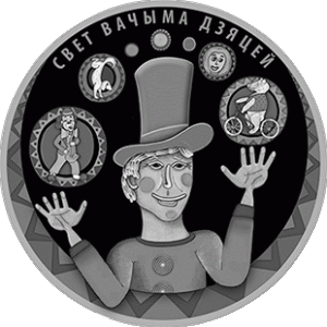 In the center - an image of a clown juggling balls with images of a saxophonist, a dog, a girl's face and a bear on a bicycle; at the top- circle inscription: "СВЕТ ВАЧЫМА ДЗЯЦЕЙ" (THE WORLD THROUGH CHILDREN’S EYES); at the bottom in a circle - a stylized ornamental strip in the shape of a moon.