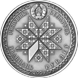 Within a circle geometric ornament – a relief image of the State Emblem of the Republic of Belarus; in the center – a solar sign consisting of octagonal geometrical figure with elements of a rhombic decor symbolizing solar rays; below – the year of coinage, on the silver coin – alloy standard;circle inscription – at the top: " РЭСПУБЛIКА БЕЛАРУСЬ " (THE REPUBLIC OF BELARUS), at the bottom: " ДВАЦЦАЦЬ РУБЛЁЎ " (TWENTY ROUBLES) on the silver coin and "АД3IН РУБЕЛЬ" (ONE ROUBLE) on the copper–nickel one.