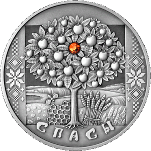 In the center – an interior of honeycomb, an apple tree (silver coin is inlaid with a synthetic crystal of orange colour imitating a ripe apple), and a sheaf of rye, symbols of the Savior of the Honey, Apple, and Bread Feast Days; in the left–hand and in the right–hand parts – relief elements of Belarussian national ornament with the motives of the Soul; at the bottom – circle inscription: "СПАСЫ" (SPASY).