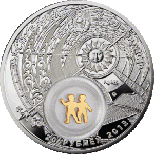 At the top there's a relief image of the State Emblem of the Republic of Belarus; in the center of the coin there is an image of a fragment from the work "Ars Magna Lucis et Umbrae" by the German scientist A. Kircher, representing the interaction of celestial bodies; on the right there's a sample, under it - the trademark of the Mint of Poland JSC. In the inscription circle: at the top - REPUBLIC OF BELARUS, at the bottom - the face value of 20 RUBLES and the year of minting.