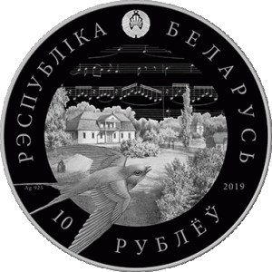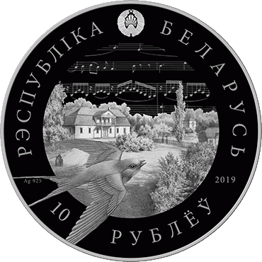 Within a circle geometric ornament — a relief image of the State Emblem of the Republic of Belarus and an inscription along the rim: "РЭСПУБЛIКА БЕЛАРУСЬ" (REPUBLIC OF BELARUS), in the center - the image of a swallow on the background of both the picture "Moniuszko country seat in Ubel" by belarusian artist Napoleon Orda and musical notes; at the bottom: "ДЗЕСЯЦЬ РУБЛЁЎ" (TEN ROUBLES) on the silver coin and "АД3IН РУБЕЛЬ" (ONE ROUBLE) on the copper–nickel coin, on the left - alloy standard (on a silver coin); on the right - year of issue.