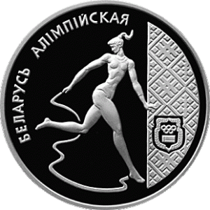 In the center - a relief image of a female gymnast with a ribbon; in the right–hand side against the ornamental background – an emblem of the National Olympic Committee of the Republic of Belarus; circle inscription: "БЕЛАРУСЬ АЛIМПIЙСКАЯ" (OLYMPIC BELARUS).