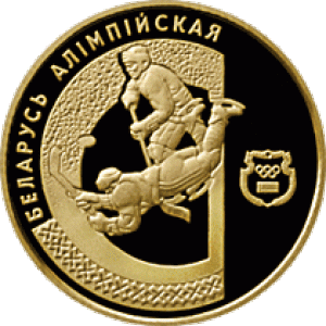 In the center - a relief image of the two ice hockey players struggling to get hold of the puck; in the right–hand side against the ornamental background – an emblem of the National Olympic Committee of the Republic of Belarus; circle inscription: "БЕЛАРУСЬ АЛIМПIЙСКАЯ" (OLYMPIC BELARUS) and a fragment of geometric ornament.