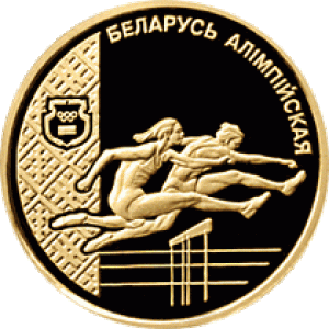 In the center - a relief image of running female athletes; in the right–hand side against the ornamental background – an emblem of the National Olympic Committee of the Republic of Belarus; circle inscription: "БЕЛАРУСЬ АЛIМПIЙСКАЯ" (OLYMPIC BELARUS).
