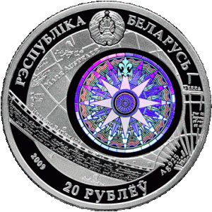 At the top - a relief image of the State Emblem of the Republic of Belarus and a circle inscription: "РЭСПУБЛIКА БЕЛАРУСЬ" (THE REPUBLIC OF BELARUS); in the center — a stylized image of the wind rose (the silver coin features a hologram thereon) against the background of the navigation sea chart; circle inscription: at the bottom - denomination: "ДВАЦЦАЦЬ РУБЛЁЎ" (TWENTY ROUBLES) on the silver coin and "АДЗІН РУБЕЛЬ" (ONE ROUBLE) on the copper–nickel one, to the left of it - the year of coinage, (on the right side of the silver coin - alloy standard and trademark of The Mint of Poland PLC.