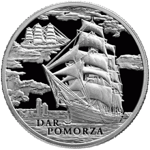 In the center – a representation of the Dar Pomorza, the longest sailing ship in the world, against the background of the seascape, on the left — an undersized image of this sailing ship (outboard profile); below — an inscription: DAR POMORZA in the original.
