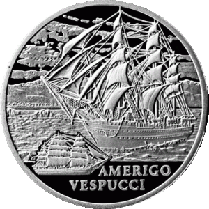 In the center – an image of The Amerigo Vespucci – one of the biggest sailing ships in the world – against the background of the sea and the coastline; on the left – a side view of the undersized image of the ship; below – an inscription: AMERIGO VESPUCCI.