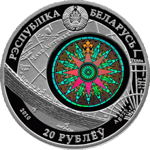 At the top - a relief image of the State Emblem of the Republic of Belarus and a circle inscription: "РЭСПУБЛIКА БЕЛАРУСЬ" (THE REPUBLIC OF BELARUS); in the center — a stylized image of the wind rose (the silver coin features a hologram thereon) against the background of the navigation sea chart; circle inscription: at the bottom - denomination: "ДВАЦЦАЦЬ РУБЛЁЎ" (TWENTY ROUBLES) on the silver coin and "АДЗІН РУБЕЛЬ" (ONE ROUBLE) on the copper–nickel one, to the left of it - the year of coinage, (on the right side of the silver coin - alloy standard and trademark of The Mint of Poland PLC.