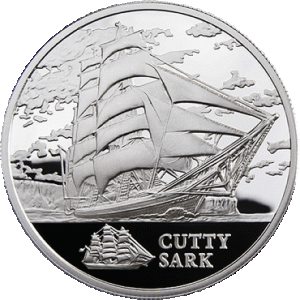 In the center – an image of a singular surviving tea clipper in the world for today - The Cutty Sark – against the background of the sea landscape; at the bottom – a side view of the undersized image of the ship; on the right – an inscription: THE CUTTY SARK.