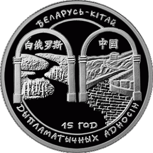 At the top – circle inscription: "БЕЛАРУСЬ – КІТАЙ" (BELARUS–CHINA); in the center – two arches symbolizing the openness of relations and cooperation between both countries; in the left–hand arch – the landscape typical of Belarus and an inscription in Chinese: "BELARUS"; in the right–hand arch – a representation of the Great Wall of China and an inscription in Chinese: "CHINA"; at the bottom – a circle inscription engraved in two lines: "15 ГОД ДЫПЛАМАТЫЧНЫХ АДНОСІН" (15 YEARS OF DIPLOMATIC RELATIONS).