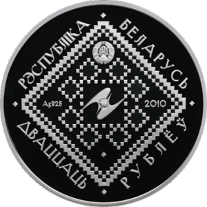 At the top - a relief image of the State Emblem of the Republic of Belarus (in the middle) with an inscription: "РЭСПУБЛІКА БЕЛАРУСЬ" (THE REPUBLIC OF BELARUS) above it; in the center - a representation of the EurAsEC logo framed by an ornamental pattern symbolizing the Candlemas taper; at the bottom — denominations: "ДВАЦЦАЦЬ РУБЛЁЎ (TWENTY ROUBLES) on the silver coin and "АДЗIН РУБЕЛЬ" (ONE ROUBLE) on the copper-nickel one, to the right of the logo — the year of coinage and to the left — alloy standard (on the silver coin).