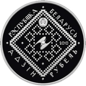 At the top - a relief image of the State Emblem of the Republic of Belarus (in the middle) with an inscription: "РЭСПУБЛІКА БЕЛАРУСЬ" (THE REPUBLIC OF BELARUS) above it; in the center - a representation of the EurAsEC logo framed by an ornamental pattern symbolizing the Candlemas taper; at the bottom — denominations: "ДВАЦЦАЦЬ РУБЛЁЎ (TWENTY ROUBLES) on the silver coin and "АДЗIН РУБЕЛЬ" (ONE ROUBLE) on the copper-nickel one, to the right of the logo — the year of coinage and to the left — alloy standard (on the silver coin).
