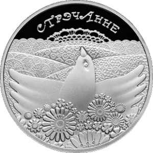 In the center - a relief image of a bird flying over the fields covered in snow (on the silver coin the bird is gold-plated), a symbol of the meeting between winter and summer.