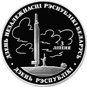 In the center – a relief image of the "Hero City Minsk" obelisk; in the right–hand side – the inscription in two lines: "3 ЛIПЕНЯ" (3rd JULY); circle inscriptions: "ДЗЕНЬ НЕЗАЛЕЖНАСЦI РЭСПУБЛIКI БЕЛАРУСЬ" (INDEPENDENCE DAY OF THE REPUBLIC OF BELARUS) and "ДЗЕНЬ РЭСПУБЛIКI" (DAY OF THE REPUBLIC).