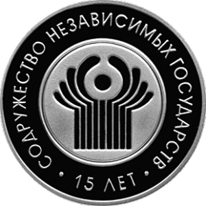 In the center – a relief image of an emblem of the Commonwealth of Independent States made on the silver coin with pad–printing of blue, white and yellow paints; circle inscription: "COMMONWEALTH OF THE INDEPENDENT STATES · 15 YEARS".