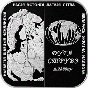 In the left-hand side at the top - a relief image of the State Emblem of the Republic of Belarus; circle inscription: "РЭСПУБЛIКА БЕЛАРУСЬ" (THE REPUBLIC OF BELARUS); in the center – a planimetric plotting of the Republic of Belarus and the circuit of points of The Struve Geodetic arc on its territory, at the bottom – the year of coinage, alloy standard and denomination: "ДВАЦЦАЦЬ РУБЛЁЎ"(TWENTY ROUBLES) on the silver coin and "АДЗІН РУБЕЛЬ" (ONE ROUBLE) on copper–nickel coin.